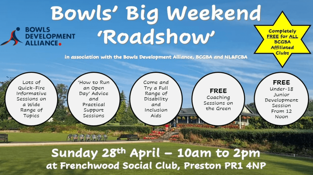 On Sunday 28th April, in conjunction with the Bowls Development Alliance and the British Crown Green Bowling Association (Official), North Lancs and Fylde County Bowling Association will be hosting the first Crown Green ‘Bowls’ Big Weekend Roadshow’.