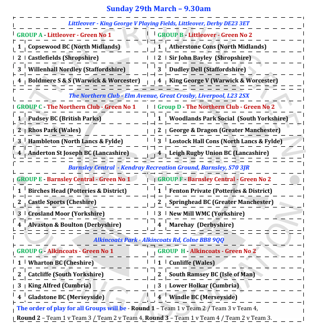 Both Hambleton and Lostock Hall Cons Bowling clubs qualified to take part in this National competition as winners and runners up in our 2025 County Team Competition and will now compete at The Northern Club, Elm Avenue, Great Crosby, Liverpool, L23 2SX. Thirty two teams comprising of 8 players will compete at four different venues around the Country in a round robin format, with the Group winners progressing to the final’s day on Sunday 26th April, venue TBC. The competition draw can be seen below.