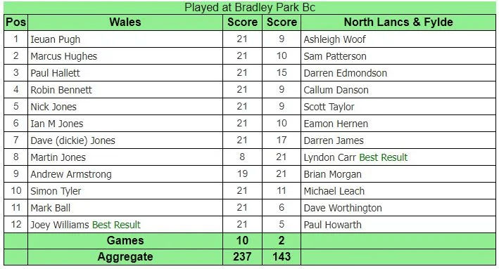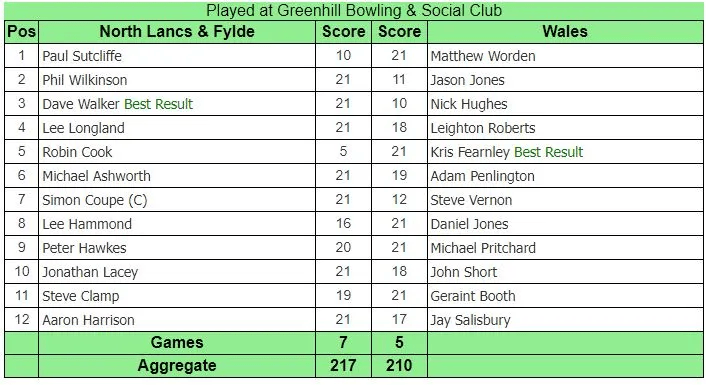 Match Result: NL & Fylde 360 lost to Wales 447 (+87)