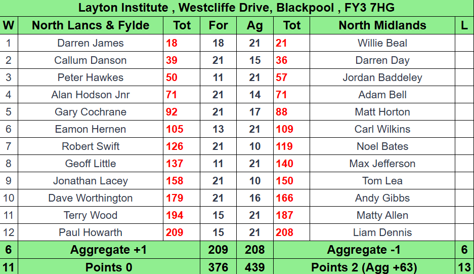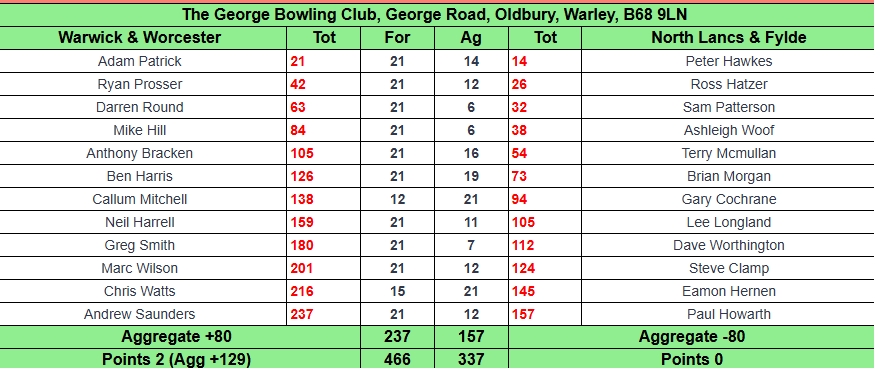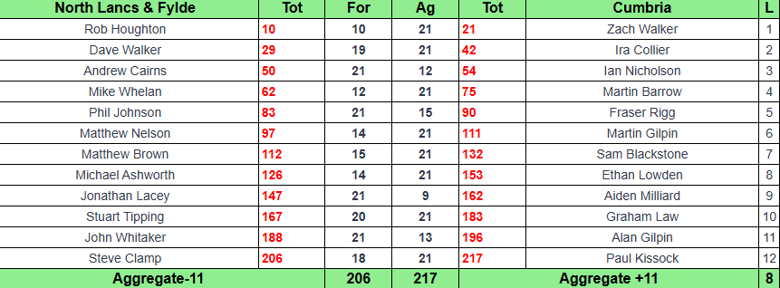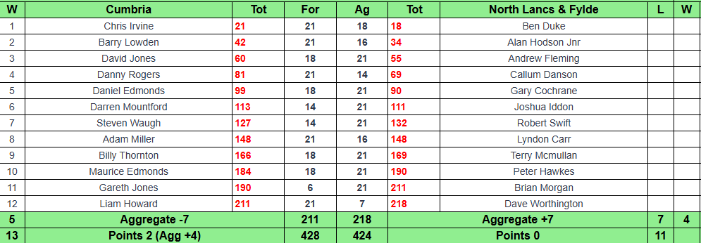 In the final match of the season, North Lancs & Fylde took on Cumbria as they looked to end the season with a win. The home match was played at St.Andrews Bowling Club in Burnley. Cumbria brought a strong away side, which resulted in them winning 8 of the 12 games and taking the aggregate chalks by +11.
