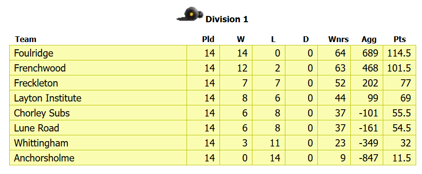 Foulridge were the winners in Division 1 for the second year in succession, with Frenchwood runners-up