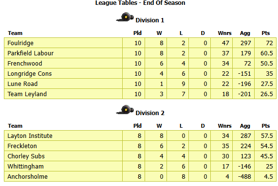 Foulridge were the winners in Division 1 and Layton Institute in Division 2.